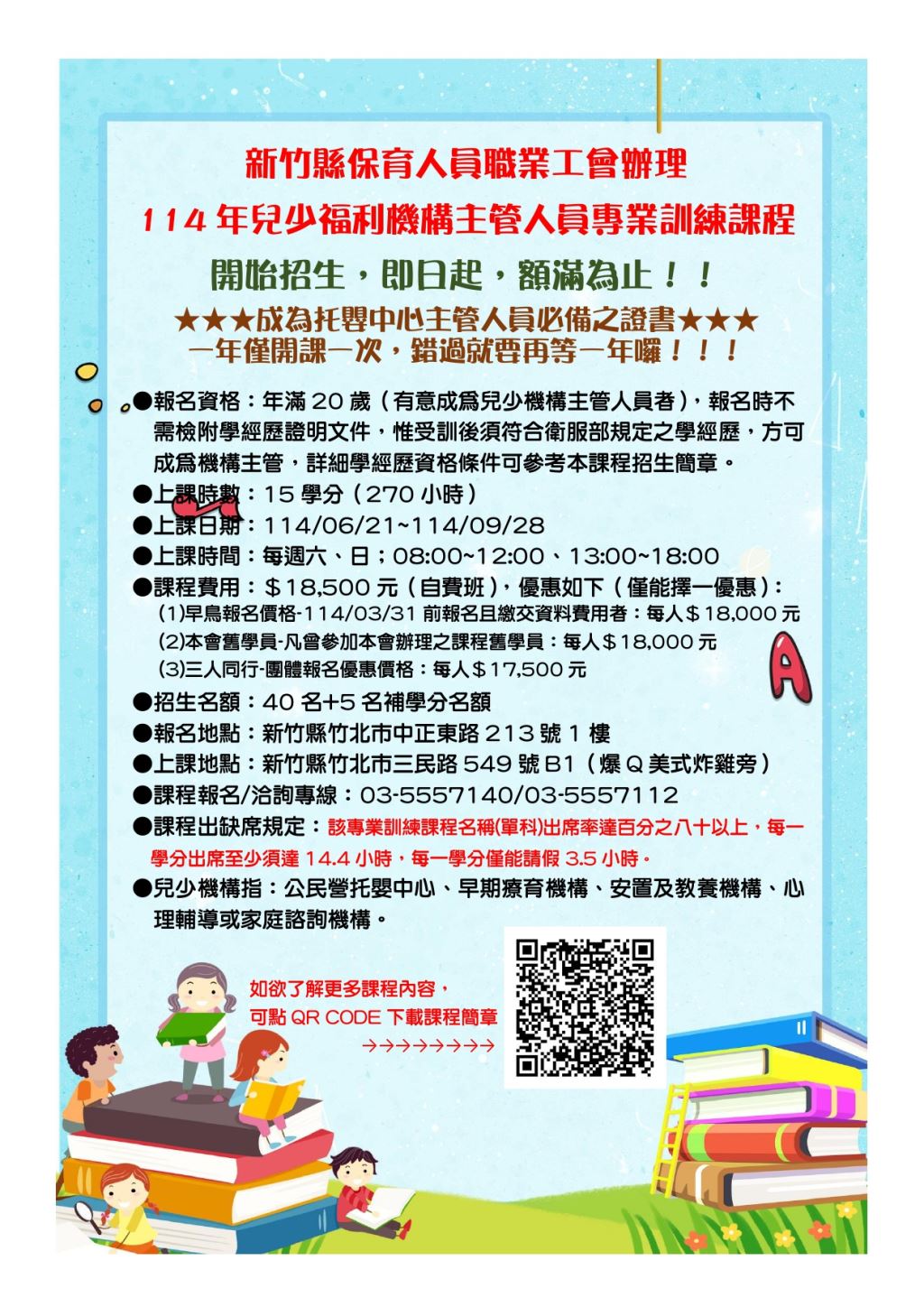 114年兒童及少年福利機構主管人員專業訓練課程【自費班】招生訊息